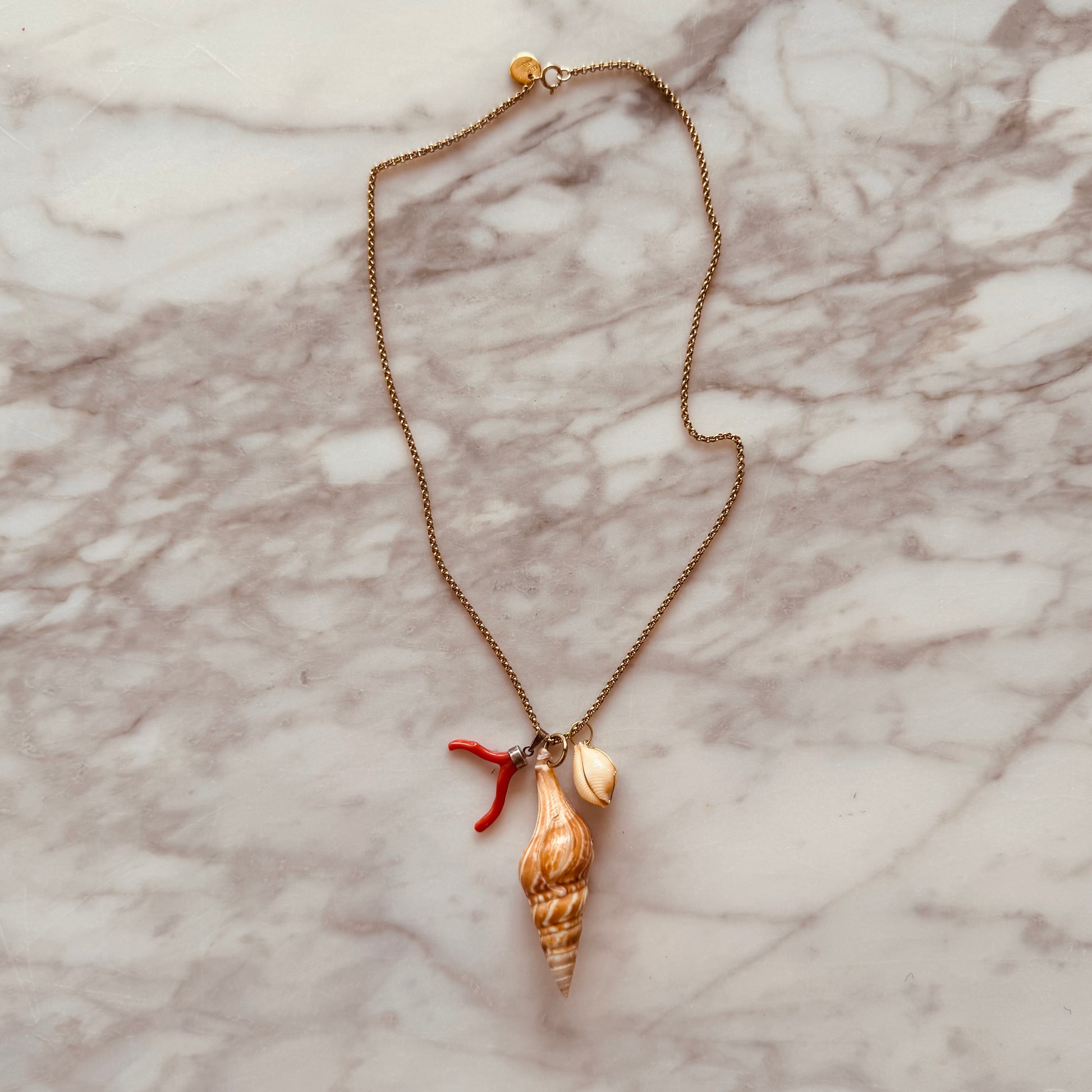 Single piece handcrafted necklace with real Coral, a special kauri shell and a big shell. The clasp is 14k gold filled